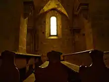L'abbatiale actuelle est construite assez tardivement, aux XIVe et XVe siècles, en remplacement d'un édifice en style roman tardif, et est de style gothique[4].