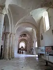 Huit travées en plein cintre furent construites entre 1035 et 1087, mais les cinq premières furent démolies au début du XIXe siècle[20],[note 2]. L'abbatiale (1080-1110) reprend le plan bénédictin adopté à Bernay avec la nef à trois élévations : arcades, tribunes et fenêtres hautes[21]. Le premier niveau comporte de grandes arcades à double rouleau et tore retombant sur des piles cruciformes, le deuxième niveau possède des tribunes, précédées d'une petite coursive d'à peine trente centimètres de large, ouvrant sur la nef par des baies géminées, et le troisième niveau des fenêtres hautes avec une galerie de circulation dans l'épaisseur du mur[22]. Les collatéraux nord et sud sont voûtés d'arêtes. Quatre arcs diaphragmes encadrent la croisée du transept. Initialement en plein cintre, ils furent modifiés, au XVe siècle, en ogives pour renforcer la structure et soutenir la tour-lanterne. Le bras nord du transept date du XVIIIe siècle, reconstruit à la suite d'un effondrement. Le bras sud, lui, est d'origine[3]. Les croisillons du transept sont surmontés de tribunes[23]. Deux baies géminées inscrites dans une grande arcade s'ouvrent largement sur les tribunes[23]. À l'étage supérieur, la galerie de circulation est évidée par un triplet de grandes arcades[23]