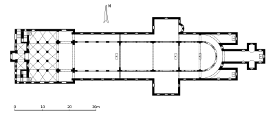 La basilique à trois nefs fut commencée en 830 et consacrée en 844. De 873 à 885 le massif occidental (Ouvrage ouest) fut ajouté sur le modèle de la chapelle palatine d'Aix-la-Chapelle. C'était l'un des plus grands bâtiments du nord de l'Allemagne à l'époque. Il constitue aujourd'hui non seulement la plus ancienne construction monumentale de Westphalie et un vénérable sanctuaire régional, mais encore le plus ancien ouvrage architectural de ce type qui ait subsisté en Occident. Les fresques du IXe siècle qu'on peut y admirer comportent des motifs anciens tirés de l’Odyssée. La façade de type « massif occidental » est réputée être l'exemple le plus ancien encore debout de cette particularité carolingienne.
