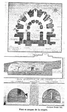 Des fouilles ponctuelles se sont succédé sur le site de l'abbatiale Notre-Dame de Déols depuis le XIXe siècle (découverte du tombeau d'un abbé de Déols en 1886[33]). Mais ce sont les fouilles archéologiques effectuées méthodiquement de 1924 à 1926 qui ont permis pour la première fois de proposer une restitution du plan de la grande église abbatiale de Déols[34]. Ces fouilles furent suivies journellement par l'abbé Babou, curé de Déols, leur marche fut réglée par Eugène Hubert (archiviste départemental de l'Indre) avec François Deshoulières correspondant du ministère, directeur adjoint de la Société Française d'Archéologie et régulièrement vérifiées par Jean Hubert (depuis 1926 archiviste départemental de Seine-et-Marne). C'est Jacques Barge, architecte diplômé du gouvernement, membre de la Société Française d'Archéologie qui effectua le relevé des fouilles et les plans de restitution.