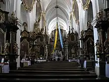 Dans l’église, il y a aussi des stalles baroques, chef-d’œuvre de la sculpture sur bois en Silésie. Le fond des stalles en bois de chêne qui a été construit dans le style renaissance, vient de 1567. Sur les stalles, il y a des riches ornements sous une forme d’acanthe et de coquilles. Les dossiers sont ornés de 36 bas-reliefs qui présentent les scènes de la vie du Christ. Ils ont été faits de bois de tilleul. Après 1700, on a ajouté les loges d’abbé et de prieur, et de plus, on a installé les figures de Saint Grégoire le Grand, d’Eugène III, de Saint Jérôme, de Konrad de Poitiers, de Saint Benoît et de Saint Bernard.