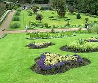 Mitchell Henry fit établir à l'ouest du château, sur le flanc sud de Duchruach Mountain, un jardin entouré d'un mur de briques et de pierre, destiné à la fois à l'agrément et à l'alimentation ; un ruisseau issu du Lough Touther effectuait naturellement la séparation entre les deux parties du jardin[9]. Les jardins possédaient également des serres, reliées entre elles pour former un jardin d'hiver. Elles contenaient des plantes exotiques comme des bananiers, et étaient chauffées par le sol[9]. Le jardin comportait également des logements pour le jardinier en chef et pour les ouvriers ; le tout premier jardinier en chef de Kylemore Castle, James Garnier, y vécut[9].