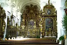 L'abbatiale mesure 55,68 mètres de longueur pour 21,84 de largeur, avec une hauteur de 18,40 mètres. Son plan est complètement symétrique, flanquée du cloître, gittante su di un'ampia corte. Non loin se trouve le splendide cancello de l'entrée principale, érigé au XVIe siècle et modifié à plusieurs reprises jusqu'au XVIIIe siècle, tandis que tout l'intérieur est réaménagé en style rococo. La reconstruction de l'église est projetée par Nikolaus Wierith en 1674 avec l'architecte italien Tommaso Comacio, mais n'est pas réalisée par manque de moyens financiers ; l'église est tellement vétuste que l'abbaye décide elle-même en 1685 de nouveaux travaux, sous la direction de Michael Thumb et de son cousin Franz Beer, qui termine le chantier. L'église est consacrée le 11 septembre 1701 par l'évêque de Constance. Les fresques au-dessus de l'autel sont exécutées en 1695 par Johannes Heiß (1640-1704) de Memmingen.