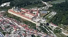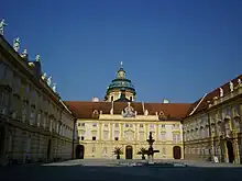 Le visiteur passe sous le porche Saint Benoit (Benediktihalle) et se retrouve dans la cour des prélats à la fois élégante et majestueuse. Le regard se pose d'emblée sur la coupole de l'église et sur les deux tours qui la flanquent. La fontaine, formée au XVIIIe siècle, a été installée ici au début du XIXe.