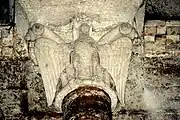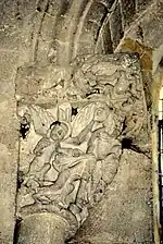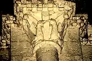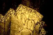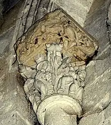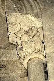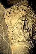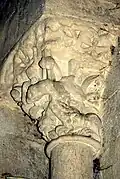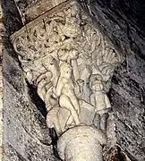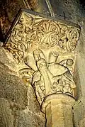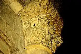 Le chapiteau est très abîmé, mais mérite attention en raison de la qualité des reliefs qui ont survécu au vandalisme.