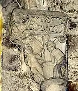 On trouve quatre personnages disposés en demi-cercle, représentant une scène de martyre. Le tailloir est timbré à l'angle d'un masque animalier dont la gueule vomit deux frises de palmettes ligaturées par des galons perlés.