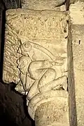 Le tailloir du chapiteau alterne rinceaux et palmettes. Aux angles, se trouvent des masques cracheurs. Sur la corbeille deux personnages, accroupis et de dos, semblent s'accrocher à deux rameaux et la tête de chacun plonge dans la gueule d'un fauve anthropophage. Les têtes des bêtes sont mi-léonines, mi-humaines.