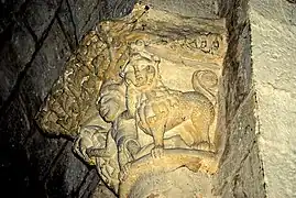 La réalisation de ce chapiteau est incomplète, une des faces visibles de la corbeille est à peine dégrossie. Le tailloir, une frise de spires et palmettes, est corrodé par une action chimique (hygrométrie acide ?). Sur la corbeille on voit deux lions allongés en vis-à-vis, qui entrelacent leurs cous distendus. Même si l'édacité du temps a rongé leur forme on peut toujours distinguer des crinières à boucles, des griffes et des queues à pinceau qui se dressent sur les croupes. Sur la face latérale, le mufle du lion recrache une gerbe étoilée formée de deux palmettes trifoliées et, sur la face principale, le lion tient en sa gueule une grosse liane torsadée et terminée en crossettes qui emprisonne un petit homme aux jambes repliées, cul par-dessus tête, qui se raccroche à une espèce de chien.