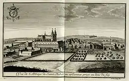 Vue distante de la basilique et du quartier abbatial | |||