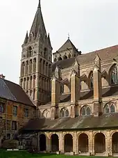 Clocher XIIe siècle située au sud de la façade, avec quatre étages d’arcatures. Le dernier niveau présente sur chaque face, une baie à arc brisé entourée de quatre oculi. Elle ne servit jamais de clocher, les moines l’utilisaient comme pigeonnier et comme donjon. La flèche, recouverte de tuiles, est du XIIIe siècle.