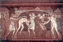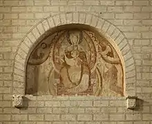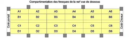 Les peintures ont été soumises aux intempéries et sont partiellement détruites, on peut quand même y voir un Christ en gloire entouré d'anges portant les instruments de la Passion et salué par des groupes d'apôtres peints sur les parois voisines, et des épisodes de l'Apocalypse : Combat de l'Archange et de la Bête, le Fléau des sauterelles évocation saisissante de la Vision de Saint Jean. La luminosité est plus faible que dans la nef. Aussi les artistes ont-ils choisi des couleurs plus contrastées et plus vives. Les scènes d'Apocalypse sont un thème généralement dévolu au Moyen Âge à la partie occidentale de l'église, comme c'est le cas ici.