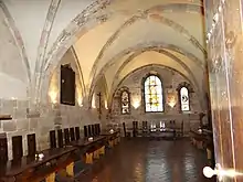 L'aile méridionale de l'abbaye regroupait le chauffoir, les cuisines et le réfectoire ; seul ce dernier est conservé dans son état primitif, les autres pièces ayant été démolies au XVIIe siècle. Il est perpendiculaire à la galerie du cloître, de forme rectangulaire et à trois travées d'une grande portée sans appui intermédiaire[15]. Dans ces bâtiments moins nobles que l'église, la brique commence à être utilisée, sous forme d'éléments de grandes dimensions, y compris dans les voûtes[16].