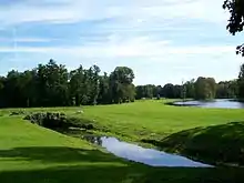 Au sud de l'abbaye, s'étend le vaste parc à l'anglaise, aménagé à partir de la fin des années 1830 par un paysagiste irlandais, et dont l'architecture paysagère d'origine ne subsiste plus que dans les grands traits. La grande allée de marronniers reliant l'abbaye à la RD 330 date aussi de cette époque[50]. Reste un paysage d'une grande harmonie toujours digne d'intérêt. Un étang de plus de 400 m de long occupe le centre du parc, entouré de prés servant actuellement de pâturage aux chevaux. Entre le château et l'étang, arrive de l'est un affluent de la Nonette, enjambé par deux ponts en pierres brutes, dans le goût de l'époque. Un sentier part en face du château et longe toute la rive ouest de l'étang, accompagné par la Nonette de l'autre côté. La petite rivière arrive par son lit détourné depuis le sud. Près de l'extrémité sud de l'étang, se situe le pavillon de l'Anguillière, l'un des rares bâtiments de ce type encore existants[46],[51] et qui est supposé dater du XIIIe siècle. Restauré pendant les années 1840[52], il se présente comme une petite maison à deux étages quasiment carré, sur une cave à moitié enterrée, avec un toit à quatre versants. Un petit escalier conduit à la porte d'entrée sous plein cintre, au milieu de la façade principale. L'étage est percée de deux baies gemellées au-dessus de la porte, étroite et également de plein cintre. La porte basse de la cave se trouve à gauche de l'escalier extérieur.