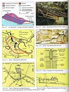 Malgré l’arrêt de l’activité de la mine à ciel ouvert, une masse énorme de la colline (fig. IV-2), qui se manifestait par une faille qui avançait de 0,85 mètre par an, s’est mise en mouvement à huit cents mètres environ du monument. À une centaine de mètres de l’abbaye un autre mouvement, plus lent, a eu des effets alarmants sur les maçonneries (fig. IV-5, 6), nécessitant notamment l’étaiement de la grange dîmière et du mur sud du verger. Une galerie en forme de fer à cheval (fig. IV-8), de 520 mètres de long et de 8 m2 de section, a été créée pour collecter des drains verticaux (fig. IV-4, 7). Elle a permis d’évacuer les eaux vers le vallon du Tombereau en aval de l’abbaye. Le but du drainage était de consolider les terrains proches de l’abbaye pour enrayer le glissement en augmentant le coefficient de frottement des terrains[27].