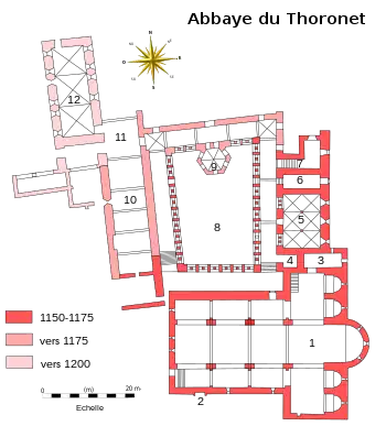 Le premier bâtiment à être construit au Thoronet a été le cellier ainsi qu’un bâtiment près de la porterie, qui n’existe plus dans son état originel et qui servait sûrement d’hostellerie. Ces choix de constructions sont tout à fait traditionnels pour une abbaye cistercienne et répondent aux préceptes de la règle de saint Benoît.