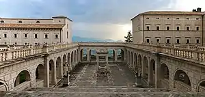 L’abbaye territoriale du Mont-Cassin a été également fondée par Benoît de Nursie en 529 sur le site d'une ancienne tour et d'un temple dédié à Apollon, situé à 519 mètres d'altitude. Elle est le berceau de l’ordre des Bénédictins[1]. Elle sert de retraite à des souverains et à des pontifes tels que le prince franc Carloman, frère de Pépin le Bref, le roi lombard Ratchis (avec sa famille), et saint Grégoire[Lequel ?].