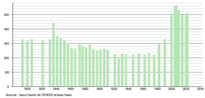 L'évolution du nombre d'habitants est connue à travers les recensements de la population effectués dans la commune depuis 1793. Pour les communes de moins de 10 000 habitants, une enquête de recensement portant sur toute la population est réalisée tous les cinq ans, les populations légales des années intermédiaires étant quant à elles estimées par interpolation ou extrapolation[28]. Pour la commune, le premier recensement exhaustif entrant dans le cadre du nouveau dispositif a été réalisé en 2004[29].