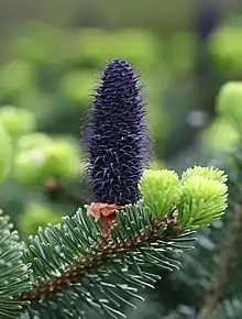 Les cônes femelles (à graines) portés par un pédoncule court sont d’abord bleu pourpre foncé puis violet sombre et noir à maturité, cylindriques ou ovoïdes-cylindriques, dressés, de 6–11 cm de long sur 3–4 cm[4]. La graine obovale de 5–8 mm à aile presque aussi longue atteint la maturité en octobre.