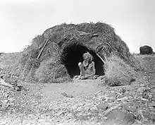 Un homme Arrernte du Territoire du Nord et une hutte traditionnelle en 1920.