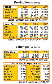 Production d'abricots en France et en Europe de 2005 à 2007.