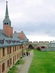 Les premiers colons européens s'établissent en Acadie en 1604, durant l'expédition de Pierre Dugua de Mons. L'Habitation de l'île Sainte-Croix est alors fondée et une douzaine de maisons sont construites et agencées de telle façon que l'impression donnée est celle d'un fort. Les édifices sont d'inspiration française, avec leur toit aigu à quatre versants[45]. Le froid, le manque d'eau douce et le scorbut tuent au moins 35 hommes. En 1605, les maisons sont alors démolies afin de récupérer les matériaux qui sont transportés pour établir l'Habitation de Port-Royal, où tout est reconstruit sur le même modèle, mais cette fois-ci l'établissement est mieux fortifié. En effet, les différents bâtiments sont organisés côte à côte autour d'une cour centrale et leurs murs arrière forment en quelque sorte une muraille ; un bastion est installé de chaque côté de l'entrée.