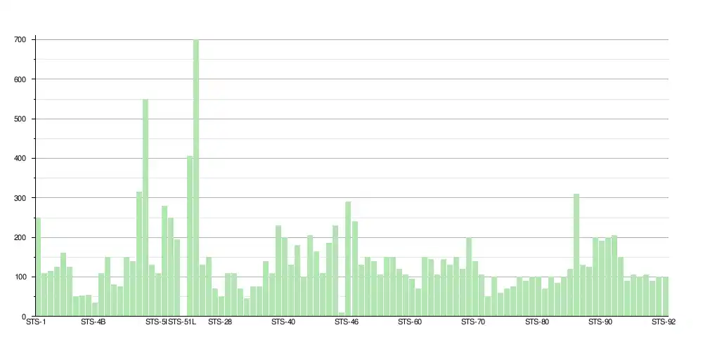 Cent cinquante neuf impacts constatés sur le bouclier thermique de la navette. Deux trous dans la mousse isolante du réservoir externe de 20 cm et 30 cm sont identifiés comme la cause des impacts. Première fois qu'aucune action correctrice n'est apportée et que l'incident est classé comme inexpliqué / isolé. La mission suivante STS-45 est lancée avant que l'incident ne soit clos. | |
