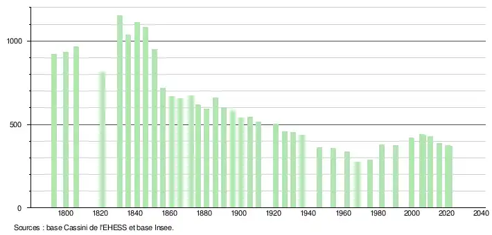L'évolution du nombre d'habitants est connue à travers les recensements de la population effectués dans la commune depuis 1793. Pour les communes de moins de 10 000 habitants, une enquête de recensement portant sur toute la population est réalisée tous les cinq ans, les populations légales des années intermédiaires étant quant à elles estimées par interpolation ou extrapolation[24]. Pour la commune, le premier recensement exhaustif entrant dans le cadre du nouveau dispositif a été réalisé en 2005[25].