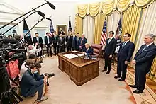 - Une déclaration trilatérale entre Israël, les Émirats arabes unis et Bahreïn, nommée « Déclaration des Accords d’Abraham (Abraham Accords Declaration) » à laquelle le président américain Donald Trump appose sa signature en tant que témoin[23].