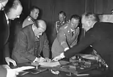 Les accords de Munich sont signés entre l'Allemagne, la France, le Royaume-Uni et l'Italie représentés respectivement par Adolf Hitler, Édouard Daladier, Neville Chamberlain et Benito Mussolini (ce dernier s'étant commis en intermédiaire) à l'issue de la conférence de Munich du 29 au . Le président tchécoslovaque, Edvard Beneš, et le secrétaire général du Parti communiste de l'Union soviétique, Joseph Staline, ne sont pas invités.