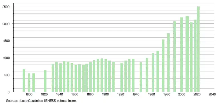 L'évolution du nombre d'habitants est connue à travers les recensements de la population effectués dans la commune depuis 1793. Pour les communes de moins de 10 000 habitants, une enquête de recensement portant sur toute la population est réalisée tous les cinq ans, les populations légales des années intermédiaires étant quant à elles estimées par interpolation ou extrapolation[34]. Pour la commune, le premier recensement exhaustif entrant dans le cadre du nouveau dispositif a été réalisé en 2007[35].