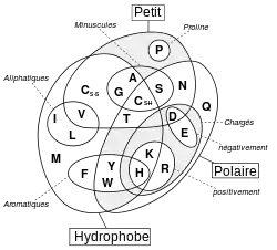 Un acide aminé est un acide carboxylique qui possède également un groupe fonctionnel amine. De tels composés organiques ont donc à la fois un groupe carboxyle –COOH et un groupe amine, par exemple une amine primaire –NH2 ou une amine secondaire –NH–. Dans le monde vivant, on connaît environ 500 acides aminés, dont environ 149 sont présents dans les protéines[1]. Ces acides aminés peuvent être classés de nombreuses manières différentes[2] : on les classe ainsi souvent en fonction de la position du groupe amine par rapport au groupe carboxyle en distinguant par exemple les acides α-aminés, β-aminés, γ-aminés ou δ-aminés ; on peut également les classer en fonction de leur polarité, de leur point isoélectrique ou de leur nature aliphatique, aromatique, cyclique ou à chaîne ouverte, voire de la présence de groupes fonctionnels autres que le carboxyle et l'amine qui définissent cette classe de composés.