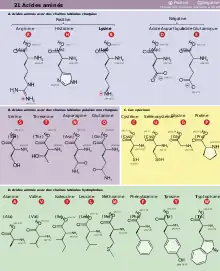 Les acides aminés protéinogènes sont les unités de base de construction des protéines. Ils polymérisent en formant des polypeptides linéaires dans lesquels les résidus d'acides aminés sont unis par des liaisons peptidiques. La biosynthèse des protéines se déroule sur les ribosomes[8], qui réalisent la traduction de l'ARN messager en protéines. L'ordre dans lequel les acides aminés sont liés à la chaîne polypeptidique est spécifié par la succession des codons portés par la séquence de l'ARN messager, lequel est une copie de l'ADN du noyau cellulaire ; ces codons, qui sont des triplets de nucléotides, sont traduits en acides aminés par des ARN de transfert selon le code génétique. Celui-ci spécifie directement 20 acides aminés, auxquels s'ajoutent deux autres acides aminés à travers un mécanisme plus complexe faisant intervenir, pour la sélénocystéine, un élément SECIS qui recode le codon-stop UGA[9] et, pour la pyrrolysine, un élément PYLIS[10] qui recode le codon-stop UAG[11]. La planche ci-dessous présente la structure chimique des 22 acides aminés protéinogènes :