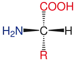 En biochimie, les acides α-aminés jouent un rôle crucial dans la structure, le métabolisme et la physiologie des cellules de tous les êtres vivants connus, en tant que constituants des peptides et des protéines. Ils constituent à ce titre l'essentiel de la masse du corps humain après l'eau. Ils présentent, à de rares exceptions près[3], une structure générique du type H2N–HCR–COOH, où R est la chaîne latérale identifiant l'acide α-aminé. Toutes les protéines de tous les êtres vivants connus ne sont constituées — à quelques exceptions près — que de 22 acides aminés différents, parfois légèrement modifiés, dits acides aminés protéinogènes. Parmi ceux-ci, 19 acides aminés ne contiennent que quatre éléments chimiques : le carbone, l'hydrogène, l'oxygène et l'azote ; deux acides aminés contiennent en plus un atome de soufre, et un acide aminé assez rare contient un atome de sélénium. Ces acides aminés forment de longs biopolymères linéaires, appelés polypeptides, dans lesquels les monomères sont unis entre eux par des liaisons peptidiques. Un acide aminé engagé dans une ou deux liaisons peptidiques au sein d'un polypeptide est un résidu d'acide aminé. L'ordre dans lequel ces résidus se succèdent dans les polypeptides est la séquence peptidique et est déterminé par les gènes à travers le code génétique, qui établit une relation entre les codons de trois bases nucléiques et chacun de ces résidus.