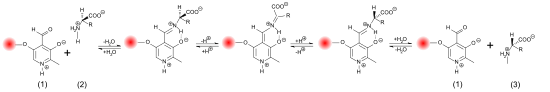 La racémisation catalysée par les bases ou les acides nécessite des conditions très drastiques pour obtenir une racémisation complète en quelques heures. Par opposition, la racémisation catalysée par des enzymes dans les systèmes biologiques est notablement plus rapide et se déroule dans des conditions plus douces : pH à peu près neutre, et température ambiante ou corporelle. Les racémases catalysent la déprotonation du carbone α de l'acide aminé. Dans cette position, l'atome d'hydrogène n'est plus que très faiblement acide. La constante d'acidité de la forme protonée a un pKs ≈ 21, et est au point isoélectrique encore plus faible avec ≈ 29[29],[30]. La déprotonation est facilitée pour la plupart des racémases par le phosphate de pyridoxal (PALP). Sur le centre actif de ces enzymes, le PALP est lié à un résidu de lysine. Le groupe amino de l'acide aminé L se lie alors au groupe aldéhyde du PALP et forme alors une imine (aldimine, ou base de Schiff). Comme catalyseur électrophile, le PALP tire sur le cycle aromatique des électrons extraits du carbone α de l'acide aminé, qui est alors plus facile à déprotoner. En outre, l'anion restant est stabilisé par effet mésomère. Une reprotonation avec addition d'eau libère alors l'acide aminé racémisé comme produit de la réaction par hydrolyse de la base de Schiff[31].