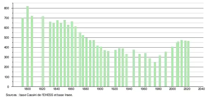 L'évolution du nombre d'habitants est connue à travers les recensements de la population effectués dans la commune depuis 1793. Pour les communes de moins de 10 000 habitants, une enquête de recensement portant sur toute la population est réalisée tous les cinq ans, les populations légales des années intermédiaires étant quant à elles estimées par interpolation ou extrapolation[30]. Pour la commune, le premier recensement exhaustif entrant dans le cadre du nouveau dispositif a été réalisé en 2007[31].