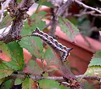 La chenille est blanchâtre au-dessous et noire au-dessus, avec des points rouges et une bande jaune sur le dos. Juste derrière la tête, une corne permet de la distinguer de la larve de « dark dagger » qui n'en a pas. Elle se nourrit d'un grand nombre de plantes, principalement des arbres et des arbustes, souvent sur l'aubépine[2] (voir la liste ci-dessous). Elle passe l'hiver à l'état de pupe.