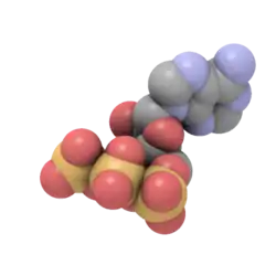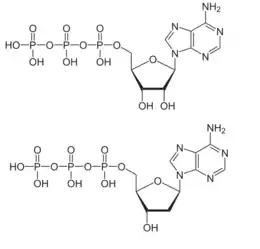Lors de la transcription de l'ADN en ARN ribosomique et en ARN messager, l'ATP est l'un des quatre nucléotides incorporés dans l'ARN par les ARN polymérases. L'énergie requise pour alimenter cette polymérisation provient de l'hydrolyse du groupe pyrophosphate de l'ATP[24]. Le processus est le même que celui de la biosynthèse de l'ADN hormis le fait que l'ATP est utilisé à la place de la désoxyadénosine triphosphate (dATP).
