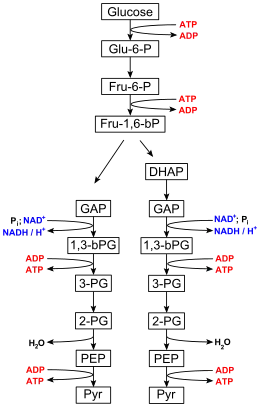 Le glucose est converti en pyruvate par une voie métabolique appelée glycolyse. La plupart des êtres vivants réalisent cette transformation dans le cytoplasme de leurs cellules, mais certains protozoaires, tels que ceux de la classe des kinétoplastidés, la réalisent dans un organite spécialisé appelé glycosome[29]. Deux molécules d'ATP sont produites pour chaque molécule de glucose oxydée par cette voie, au niveau de deux enzymes qui réalisent une phosphorylation au niveau du substrat : la phosphoglycérate kinase et la pyruvate kinase. Deux molécules de NADH sont également produites à partir de NAD+, qui peuvent être oxydées par la chaîne respiratoire et produire des molécules d'ATP supplémentaires. Le pyruvate produit à l'issue de la glycolyse est un substrat du cycle de Krebs.