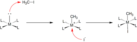 Certaines additions oxydantes ont un procédé analogue à celui d'une substitution nucléophile bimoléculaire en chimie organique. Les attaques nucléophiles du centre métallique sur un atome moins électronégatif du ligand conduit au clivage de la liaison R-X pour former une espèce de la forme [M–R]+. Cette étape est suivie par une coordination rapide de l'anion vers le centre cationique du métal. Un tel mécanisme est observé par exemple lors de la réaction entre un complexe plan carré et l'iodométhane :