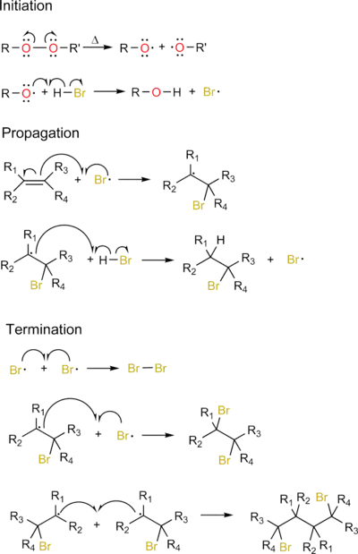 - soit à partir d'une espèce qui spontanément forme des radicaux (typiquement un peroxyde). En ce cas, une étape de transfert supplémentaire est nécessaire pour créer le radical réactif dont on a besoin (R-O. + H-Br → R-OH + Br. par exemple),
