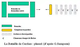 Sur le conseil d’un chef local, faux allié des Romains qui mène un double jeu, le roi d'Osroène Augarus ou Acbarus[N 3],[16],[19] (probablement un membre de la dynastie Abgar d'Osroène[N 4]), les Romains se dirigent sur une zone de plaine désertique, que Dion Cassius décrit avec des bois et des inégalités propices pour dissimuler des troupes[20]. C’est là qu’attendent les forces de Suréna. Harcelé par les archers à cheval de l'armée parthe et cherchant à éviter l’encerclement, le fils de Crassus, Publius Crassus, contre-attaque les Parthes avec 1 300 cavaliers dont ses cavaliers gaulois. Les Parthes prennent la fuite, Publius les poursuit avec sa cavalerie, suivie au pas de course par 8 cohortes et 500 archers, soit plus de six mille hommes[21]. Lorsque Publius Crassus est éloigné du gros de l’armée romaine, les cavaliers parthes arrêtent de fuir et font face, pendant que surgissent les cataphractaires (la cavalerie lourde) postés en réserve et vers lesquels la fuite des Parthes a conduit les forces de Publius Crassus. Les cataphractaires chargent la cavalerie romaine, qui est trop légère pour résister, tandis que le reste de la cavalerie parthe encercle et crible de flèches les Romains[22]. Cernés, ils sont anéantis. Publius Crassus et ses officiers se suicident ou sont tués, les Parthes ne font que 500 prisonniers. Seuls quelques messagers envoyés appeler le secours de Crassus en réchappent[23],[24].