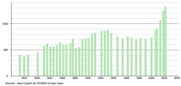 L'évolution du nombre d'habitants est connue à travers les recensements de la population effectués dans la commune depuis 1793. Pour les communes de moins de 10 000 habitants, une enquête de recensement portant sur toute la population est réalisée tous les cinq ans, les populations légales des années intermédiaires étant quant à elles estimées par interpolation ou extrapolation[25]. Pour la commune, le premier recensement exhaustif entrant dans le cadre du nouveau dispositif a été réalisé en 2008[26].