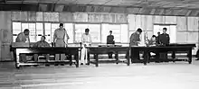Le président Truman avait entamé des négociations de paix à l'été 1951 mais la question du sort des prisonniers chinois et nord-coréens demeurait en suspens. En effet, quelque 40 000 prisonniers de ces deux nations refusaient d'être rapatriés mais tant la Corée du Nord que la Chine exigeaient leur retour[68]. À son arrivée au pouvoir, Eisenhower réclama une solution au problème et avertit la Chine qu'il était prêt à utiliser l'arme nucléaire en cas de poursuite des hostilités[69]. Le dirigeant sud-coréen Syngman Rhee tenta de saborder les pourparlers en relâchant des prisonniers nord-coréens sans leur consentement mais il accepta finalement l'idée d'un armistice après qu'Eisenhower l'eût menacé de retirer toutes les forces américaines de Corée[70]. Le , les États-Unis, la Corée du Nord et la Chine signèrent l'armistice de Panmunjeom qui mit fin à la guerre de Corée. L'historien Edward C. Keefer écrit qu'en cédant aux demandes américaines sur la liberté des prisonniers de guerre de ne pas retourner dans leur pays d'origine, « la Chine et la Corée du Nord avalèrent tout de même une pilule amère, probablement forcées en partie par l'ultimatum atomique »[71]. Pour William I. Hitchcock, l'épuisement des troupes nord-coréennes et la volonté des instances soviétiques d'éviter une guerre nucléaire en faisant pression sur la Chine furent des facteurs décisifs dans la conclusion de l'armistice[72].