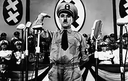 - Le Dictateur (The Great Dictator), de Charlie Chaplin. Chaplin interprète le double rôle d'« Adenoïd Hynkel », caricature d'Adolf Hitler, et de son sosie. Ce film tourne en dérision le dictateur, qui a pour sosie un petit coiffeur juif. Ce dernier se substitue au dictateur et termine le film par un discours humaniste émouvant.
