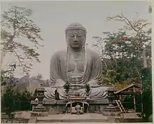 - Une tradition japonaise consiste à se rendre sur des sites célèbres (meisho, 名所) en pèlerinage, pour le tourisme ou pour trouver l'inspiration. Une tradition que les Japonais représentaient régulièrement dans l'art (ukiyo-e, peinture, poésie, etc). Les 53 stations du Tōkaidō (représentées par Hiroshige) faisaient partie de ces destinations, mais le Daibutsu, situé dans un coin peu fréquenté de Kamakura, n'était pas un meisho traditionnel, et il ne fut pas connu du grand public avant qu'il ne soit photographié par Beato en 1863, puis par Stillfried, Farsari et d'autres photographes. Par la suite, le Daibutsu et d'autres sites oubliés gagnèrent de l'importance parmi les Japonais et les touristes étrangers[25].
