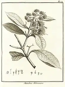 LE MANABO en arbre. (Planche 24.)Cet arbre eſt de moyenne grandeur. Son tronc s'élève de huit à dix pieds, ſur ſept à huit pouces de diamètre. L'écorce eſt griſâtre, gerſée. Le bois eſt blanchâtre: il pouſſe à ſon ſommet des branches chargées de rameaux noueux, oppoſés, & diſpoſés en croix.