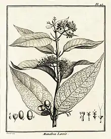 LE MANABO à feuille liſſe. (Planche 25.)La racine de cet arbrisseau pouſſe un grand nombre de tiges à quatre angles obtus. Celles-ci s'élèvent à ſept ou huit pieds, extérieurement elles ſont vertes, & contiennent dans leur intérieur une moelle blanche, renfermée dans un cylindre ligneux. Elles ſont garnies de feuilles oppoſées, & diſpoſées en croix. Ces feuilles ſont liſſes, fermés, oblongues, entières, ondées, & terminées par une longue pointe. Leur pédicule eſt gros, & courbé à ſa naiſſance : il eſt convexe en deſſous, & creuſé en goutiere en deſſus. Les plus grandes feuilles ont ſix pouces & demi de longueur ſur deux de largeur.