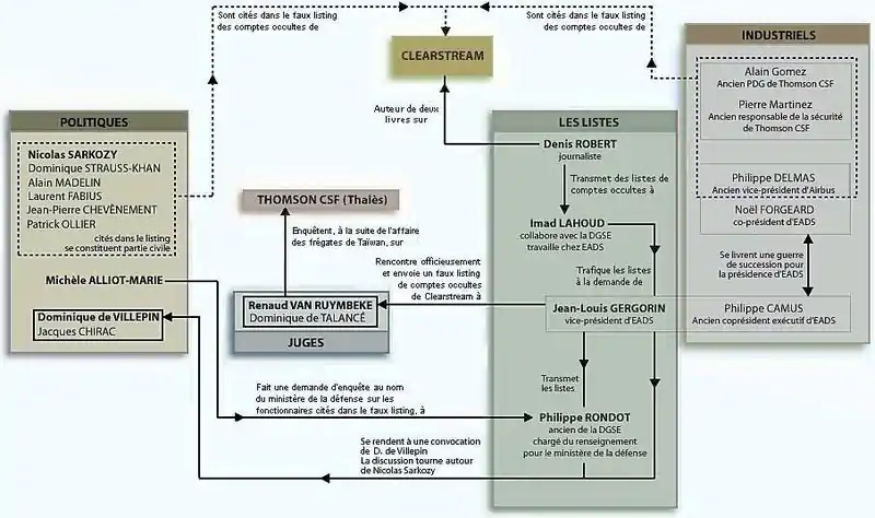 Depuis , les juges Renaud Van Ruymbeke et Dominique de Talancé enquêtent sur l’affaire des frégates de Taiwan[3]. Parallèlement, en 2001 et 2002, le journaliste Denis Robert publie deux livres (Révélation$ en 2001 et La Boîte noire en 2002) sur Clearstream, accusant cette société luxembourgeoise de dissimuler des opérations financières illégales, et lançant ainsi l’affaire Clearstream 1[7].