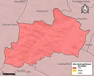 Le retrait-gonflement des sols argileux est susceptible d'engendrer des dommages importants aux bâtiments en cas d’alternance de périodes de sécheresse et de pluie. La totalité de la commune est en aléa moyen ou fort (88,8 % au niveau départemental et 48,5 % au niveau national). Sur les 69 bâtiments dénombrés sur la commune en 2019, 69 sont en aléa moyen ou fort, soit 100 %, à comparer aux 98 % au niveau départemental et 54 % au niveau national. Une cartographie de l'exposition du territoire national au retrait gonflement des sols argileux est disponible sur le site du BRGM[27],[Carte 3].