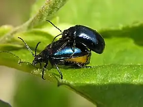 La femelle pond une fois l'an des œufs jaunes (sous les feuilles ce qui les protège de la pluie, du soleil et des prédateurs). Les larves ont une couleur proche de celle des adultes (noires à reflets métallisés bleus).